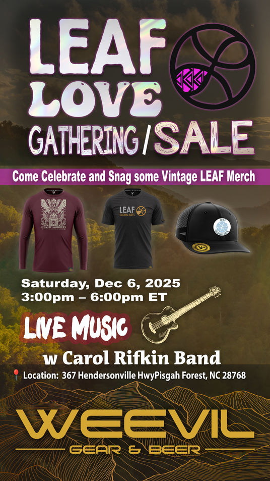 A community gathering to celebrate Weevil’s new outdoor store, our shared Pisgah roots, and a special sale on final vintage LEAF merchandise. The Weevil family (2 kids, 2 dogs, 2 parents!) supported LEAF from 2020–2025 with online presence and amazing merch — now we come together to celebrate new trails forward and keep that LEAF love going strong.